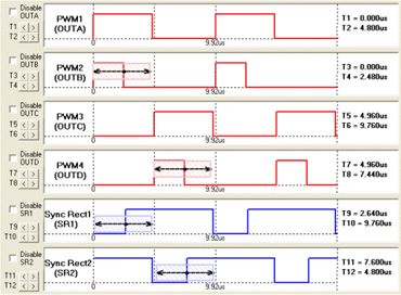因(yin)此(ci),為(wei)最(zui)大(da)限(xian)度(du)地(di)提(ti)高(gao)效(xiao)率(lv),要(yao)求(qiu)死(si)區(qu)時(shi)間(jian)盡(jin)可(ke)能(neng)小(xiao)。但(dan)是(shi)在(zai)傳(chuan)統(tong)的(de)模(mo)擬(ni)方(fang)案(an)中(zhong),自(zi)驅(qu)動(dong)型(xing)除(chu)了(le)應(ying)用(yong)的(de)限(xian)製(zhi)外(wai),還(hai)很(hen)難(nan)提(ti)供(gong)精(jing)確(que)的(de)控(kong)製(zhi)時(shi)序(xu);對於外驅動型,由於其參數是由電阻、電容等無源器件進行設定,存在誤差、老化、溫漂等問題,為保證有足夠的餘量,死區時間也不可能設置得很小。因此,ADP1043的數字方案是很好的選擇。圖2所示為ADP1043在全橋拓撲電路下的PWM和SR的GUI設置界麵。通過設置T9、T10、T11和T125便可精確獲得同步整流MOSFET所需的死區時間,其中每次調整的最小時間為5ns。