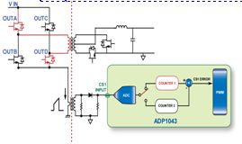 zaichuantongdeqiaoshituopudianluzhong,yibanweifangzhibianyaqidepianci,huizaibianyaqideyuanbianhuiluzhongchuanruyigegezhidianrongqi。zheyangzuocunzaiquedian,yifangmianshizengjialedianyuandechengbenhetiji,lingyifangmianyouzengjialesunhao,jiangdilexiaolv。ADP1043采用伏秒平衡控製的數字技術解決了該問題。如圖3所示,在每個開關周期中,ADP1043通過CS1分別測量流過開關管A、D和開關管B、C的電流並計算其差值,通過差值信號調節驅動信號OUTB和OUTD的脈寬,對失衡進行補償。