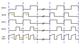 例如,如圖4所示,當CS1測量到流過開關管B、C的電流大於開關管A、D時,便會減小OUTB的脈寬,增大OUTD的脈寬,這樣流過開關管B、C的電流會減小,而流過開關管A、D的電流會增大,經過若幹周期後,電流自動實現了平衡。采用該技術後,可有效防止偏磁,並且省去隔直電容器,提高效率和可靠性。