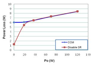 通過ADP1043的GUI可以設置關閉同步整流時的電流閾值。當輸出電流值低於該閾值時,關閉同步整流。如圖6所示為采用ADP1043設she計ji的de全quan橋qiao拓tuo撲pu的de模mo塊kuai電dian源yuan在zai不bu關guan閉bi和he關guan閉bi同tong步bu整zheng流liu在zai輕qing載zai條tiao件jian下xia的de損sun耗hao的de情qing況kuang。可ke以yi看kan到dao,當dang關guan閉bi同tong步bu整zheng流liu後hou,大da大da減jian少shao了le電dian源yuan的de輕qing載zai損sun耗hao。