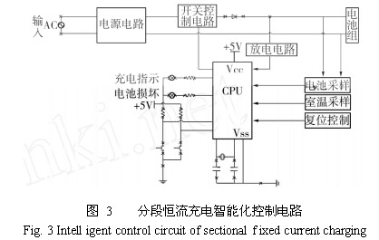 分段恒 流 充 電 智 能 化 控 製 電 路 如 圖3 所示。該電路采用 CPU 控製 ,可對充電電池和充電環境溫度進行檢測 ,對電池充電進行計時 ,采樣充電過程中電池的電壓和電流 ,對分段恒流充