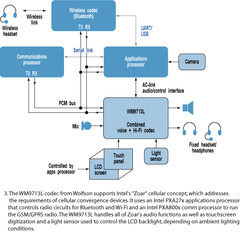 在目前的大部分電話之中,這個高保真係統是一個獨立的芯片,它含有一個立體聲DAC、一個立體聲ADC、若幹耳機和揚聲器驅動器、麥克風預放大器等等。但類似Wolfson這樣的公司目前尋求把所有這一切都集成在一起,以便該處理器可以實現語音播放和鈴聲、語音信號、藍牙連接以及更多的功能(參見圖3)。