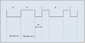 S/PDIF協議——如ru上shang文wen所suo述shu,它ta是shi一yi種zhong單dan線xian串chuan行xing接jie口kou,時shi鍾zhong嵌qian入ru數shu據ju之zhi中zhong。傳chuan輸shu的de數shu據ju采cai用yong雙shuang相xiang標biao記ji編bian碼ma。時shi鍾zhong和he幀zhen同tong步bu信xin號hao在zai接jie收shou器qi端duan與yu雙shuang相xiang解jie碼ma數shu據ju流liu一yi同tong恢hui複fu。數shu據ju流liu中zhong的de每mei個ge數shu據ju位wei都dou有you一yi個ge時shi隙xi。時shi隙xi以yi一yi個ge躍yue遷qian開kai始shi,並bing以yi一yi個ge躍yue遷qian結jie束shu。如ru果guo傳chuan輸shu的de數shu據ju位wei是shi“1”,則時隙中間還會增加一個躍遷。數據位“0”則不需要額外躍遷,躍遷之間的最短間隔稱為單位間隔(UI)。