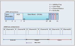 S/PDIF幀格式——首先驅動數據的最低有效位。每個幀有兩個子幀,分別是32個時隙,共64個時隙(見圖2)。子幀以一個前導碼開始,後麵跟隨24位數據,最後以攜帶用戶數據和通道狀態等信息的4位結束。子幀的前4個時隙稱為前導碼,用於指示子幀和塊的開始。前導碼有三個,每一前導碼均包含一個或兩個持續時間為3UI的脈衝,從而打破雙相編碼規則。這意味著,該模式不可能存在於數據流中的其他地方。每個子幀都以4位前導碼開始。塊的開始用前導碼“Z”和子幀通道的開始“A”表示。前導碼“X”表示通道“A”子幀的開始(不同於塊的開始),前導碼“Y”表示通道“B”子幀的開始。