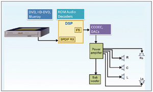 AVR/家庭影院係統——家庭影院音樂係統通常是多聲道音頻係統(見圖6)。Dolby5.1和DTS5.1是主流多聲道音頻係統。DVD播放器通過光纖或同軸電纜S/PDIF接口發送編碼音頻數據流。係統利用S/PDIF接收器芯片解碼雙相標記編碼數據,並提供與處理器相連的串行幀接口。S/PDIF接收芯片通常向處理器提供I2S格式的數據流。某些處理器片內集成S/PDIF接收器,無須使用外部接收器芯片。處理器運行自動檢測算法來確定數據流類型,如Dolby、DTS或非編碼PCM音頻流等。