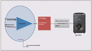圖7為一個D類放大器係統。有時將這種放大器稱為數字放大器,但事實並非如此。其工作原理仍然與其他類型放大器相同,但D類放大器的輸入信號為PWM(脈衝寬度調製)信(xin)號(hao)。由(you)於(yu)數(shu)字(zi)輸(shu)入(ru)在(zai)邏(luo)輯(ji)高(gao)電(dian)平(ping)和(he)邏(luo)輯(ji)低(di)電(dian)平(ping)之(zhi)間(jian)來(lai)回(hui)切(qie)換(huan),因(yin)此(ci)晶(jing)體(ti)管(guan)工(gong)作(zuo)在(zai)飽(bao)和(he)區(qu)間(jian)或(huo)截(jie)止(zhi)區(qu)間(jian),但(dan)決(jue)不(bu)會(hui)工(gong)作(zuo)在(zai)有(you)效(xiao)區(qu)間(jian),因(yin)此(ci)功(gong)耗(hao)始(shi)終(zhong)最(zui)低(di)。這(zhe)使(shi)得(de)功(gong)率(lv)效(xiao)率(lv)大(da)幅(fu)提(ti)高(gao),但(dan)同(tong)時(shi)也(ye)會(hui)引(yin)起(qi)較(jiao)高(gao)的(de)總(zong)諧(xie)波(bo)失(shi)真(zhen)(THD)。