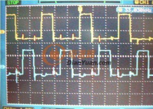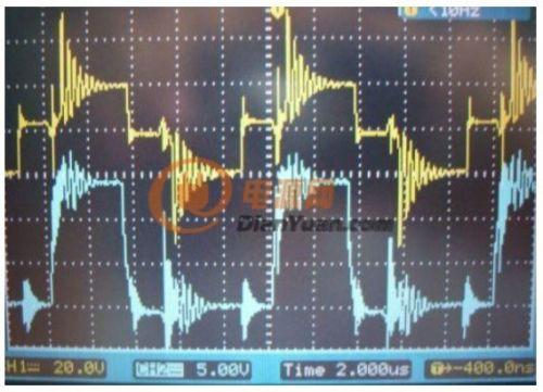此圖為實測逆變器滿載時的推挽A相與B相MOS管的G極波形(1:10),由於采用了+15V開通、-5V關斷的驅動方式,同時精選低Qgs的功率MOS管,驅動波形的“尖峰”幹擾大為減少,也可看到由於采用了負壓關斷,滿載時從對方相位串擾過來的“毛刺”被有效控製在0V線以內(紅圈),確保截止時期的MOS管能絕對可靠地截止關斷。