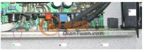 攝氏25度環境時,輸出滿載1000W,10分鍾後圖片B處(8個MOS管的中心位置)的溫度比A處高出6~8度!C處(綠圈)最低,比B處低14~15度!(C處為進風口,D為風扇,樣機為進風設計,據說是用以延長含油軸承的壽命),同樣型號並聯工作的功率MOS管,實際工作的溫差那麼大,自然對“均流”是極其不利!所以可靠性不高就不足為怪了。
