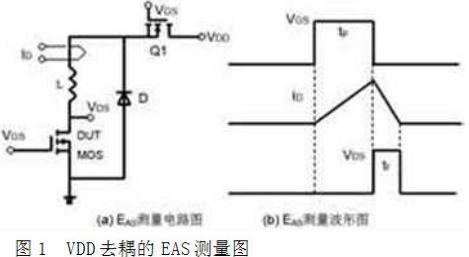 過去,傳統的測量EAS的電路圖和波形如圖2所示。注意到,VDS最後的電壓沒有降到0,而是VDD,也就是有部分的能量沒有轉換到雪崩能量中。
