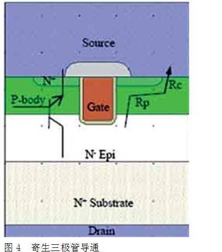 寄生三極管導通損壞:在MOSFET內部,有一個寄生的三極管(見圖4),通常三級管的擊穿電壓通常低於MOSFET的電壓。當DS的反向電流開始流過P區後,Rp和Rc產生壓降,Rp和Rc的壓降等於三極管BJT的VBEon。由於局部單元的不一致,那些弱的單元,由於基級電流IB增加和三級管的放大作用促使局部的三極管BJT導通,從而導致失控發生。此時,柵極的電壓不再能夠關斷MOSFET。