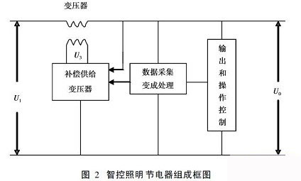 智控照明節電器組成框圖中的U1為市電輸入電壓,U2為主變壓器副邊電壓,U3為補償供給變壓器的輸出電壓(也是主變壓器的輸入電壓,或叫主變壓器的原邊電壓),U0為節電器的輸出電壓。