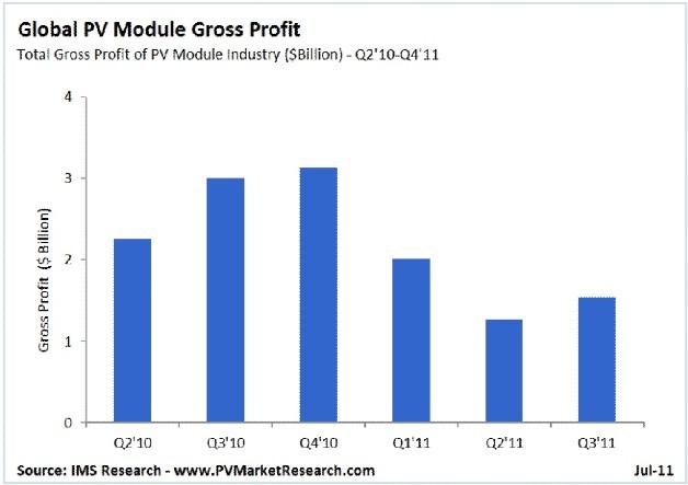 2010年,全球光伏組件供應商每季度的總毛利率平均約為25億美元,而由於利潤率下降以及出貨量減少,預計2011年第一季和第二季這個數字將下降40%。預計2011年下半年需求將再次回升,這將有助於供應商恢複利潤。IMS Research預計光伏組件供應商的總毛利率在2011年第三季和第四季將再次增長。