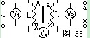 把初級線圈和次級線圈的一對同名端,例如Aa,用導線接起來,如圖38所示。然後在AX初級線圈間拉入交流電(比較低的便於測量的)。用電壓表分別測 量AX間電壓V1值,XX間電壓V2值,以及ax間電壓V3值。如果V2數值是V1與V3電壓之差,則Aa是同極性端,如果V2數值是V1與V3電壓之和,則AX是同極性端。