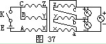 測單相變壓器時,如圖36所示,在初級線圈一側拉入一個1.5伏的幹電池,然後在次級線圈拉入一直流毫伏表。當合上開關K的一瞬間,表針朝正方向擺動(或拉開開關時表針向負方向擺),說明接電池正極一端是同極性,或叫同名端。測試三相變壓器的極性和級別,多采用直流法進行。測試方法為:在初級線圈側接上幹電池和開關K,先在A端接電池正極,B端接電池負極,再在次級線圈a、b、c之間拉入三個毫伏表,如圖37所示,