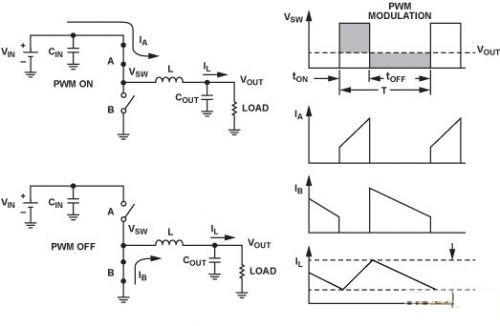 目前的低功耗同步降壓調節器以脈寬調製(PWM)為主要工作模式。PWM保持頻率不變,通過改變脈衝寬度(tON)來調整輸出電壓。輸送的平均功率與占空比D成正比,因此這是一種向負載提高功率的有效方式。