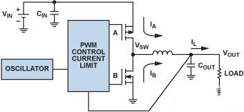 在圖 3 中,開關 A 和開關 B 分別利用 PFET 和 NFET 開關實現,構成一個同步降壓調節器。“同步”一詞表示將一個 FET 用作低端開關。用肖特基二極管代替低端開關的降壓調節器稱為“異步”(或非同步)型。處理低功率時,同步降壓調節器更有效,因為 FET 的壓降低於肖特基二極管。然而,當電感電流達到 0 時,如果底部 FET 未釋放,同步轉換器的輕載效率會降低,而且額外的控製電路會提高 IC 的複雜性和成本。