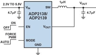 ADP2138 是一款緊湊型 800 mA、3 MHz、降壓 DC-DC 轉換器。圖 4所示為典型應用電路。圖 5顯示了強製 PWM工作模式下和自動 PWM/PSM 工作模式下的效率改善情況。由於頻率存在變化,PSM 幹擾可能難以濾除,因此許多降壓調節器提供一個 MODE 引腳(如圖 4 所示),用戶可以通過該引腳強製器件以連續 PWM 模式工作,或者允許器件以自動 PWM/PSM 模式工作。MODE 引腳既可以通過硬連線來設置任一工作模式,也可以根據需要而動態切換,以達到省電目的。