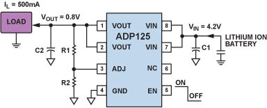 dianchidexuhangshijianshixinxingbianxieshishebeishejigaoduguanzhudeyigetexing。tigaoxitongxiaolvkeyiyanchangdianchigongzuoshijian,jiangdigenghuanhuochongdiandepindu。liru,yigelilizichongdiandianchikeyishiyongADP125 LDO以 0.8 V電壓驅動一個 500 mA負載,如圖 6 所示。該LDO的效率隻有 19% (VOUT/VIN × 100% = 0.8/4.2 × 100%)。LDO無法存儲未使用的能量,因此剩餘的 81%的功率(1.7 W)隻能以熱量形式在LDO內部耗散掉,這可能會導致手持式設備的溫度迅速上升。如果使用ADP2138 開關調節器,在 4.2 V輸入和 0.8 V輸出下,工作效率將是 82%,比前一方案的效率高出 4 倍多,便攜式設備的溫度升幅將大大減小。這些係統效率的大幅改善使得開關調節器大量運用於便攜式設備。