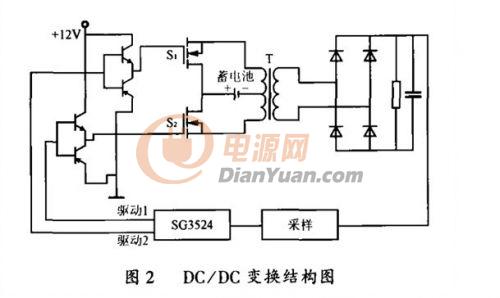 由於變壓器原邊電壓比較低,為了提高變壓器的利用率,降低成本,DC/DC變換如圖2所示,采用推挽式電路,原邊中心抽頭接蓄電池,兩端用開關管控製,交替工作,可以提高轉換效率。而推挽式電路用的開關器件少,雙端工作的變壓器的體積比較小,可提高占空比,增大輸出功率。
