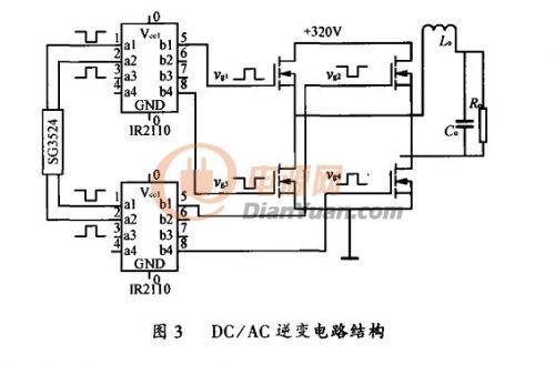 如圖3所示,DC/AC變換采用單相輸出,全橋逆變形式,為減小逆變電源的體積,降低成本,輸出使用工頻LC濾波。由4個IRF740構成橋式逆變電路,IRF740最高耐壓400V,電流10A,功耗125W,利用半橋驅動器IR2110提供驅動信號,其輸入波形由SG3524提供,同理可調節該SG3524的輸出驅動波形的D<50%,保證逆變的驅動方波有共同的死區時間。