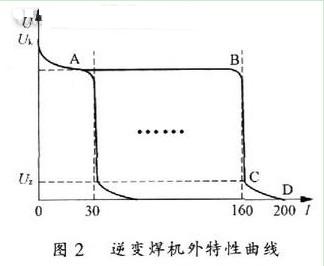 圖2所示即為高頻逆變焊機所普遍采用的一種行之有效的恒流帶外拖的外特性曲線。其中Uk為空載電壓,即焊機不工作時的輸出電壓。一個較高的空載電壓有助於起弧階段快速建立起穩定的工作狀態。一般空載電壓為90V左右;AB段(duan)為(wei)起(qi)弧(hu)階(jie)段(duan),即(ji)焊(han)機(ji)建(jian)立(li)工(gong)作(zuo)狀(zhuang)態(tai)的(de)過(guo)渡(du)過(guo)程(cheng),近(jin)似(si)於(yu)恒(heng)壓(ya)輸(shu)出(chu)。這(zhe)個(ge)過(guo)程(cheng)中(zhong)變(bian)換(huan)器(qi)以(yi)最(zui)大(da)脈(mai)寬(kuan)輸(shu)出(chu),以(yi)最(zui)快(kuai)速(su)度(du)達(da)到(dao)設(she)定(ding)工(gong)作(zuo)電(dian)流(liu)時(shi)該(gai)階(jie)段(duan)結(jie)束(shu);BC段為穩定工作階段,近似為恒流過程,使焊機具有一個平穩、恒定的工作電流;CD段(duan)為(wei)外(wai)拖(tuo)階(jie)段(duan),由(you)於(yu)焊(han)機(ji)在(zai)頻(pin)繁(fan)的(de)起(qi)弧(hu)和(he)工(gong)作(zuo)過(guo)程(cheng)中(zhong)焊(han)槍(qiang)很(hen)容(rong)易(yi)和(he)工(gong)件(jian)短(duan)路(lu)粘(zhan)連(lian),造(zao)成(cheng)焊(han)接(jie)過(guo)程(cheng)不(bu)順(shun)暢(chang),如(ru)果(guo)此(ci)時(shi)係(xi)統(tong)檢(jian)測(ce)到(dao)一(yi)個(ge)較(jiao)低(di)的(de)短(duan)路(lu)電(dian)壓(ya)後(hou)能(neng)夠(gou)相(xiang)應(ying)地(di)增(zeng)大(da)輸(shu)出(chu)電(dian)流(liu)值(zhi),就(jiu)可(ke)以(yi)將(jiang)粘(zhan)連(lian)部(bu)分(fen)熔(rong)斷(duan),從(cong)而(er)獲(huo)得(de)一(yi)個(ge)連(lian)續(xu)、平穩的焊接過程。