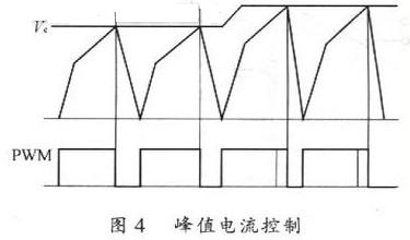 在本方案所采用的峰值電流控製模式下,腳19(RAMP)duandejuchiboxinhaoshicongbianyaqiyuanbiandedianliuxinhaojingcaiyangzhengliudedaode。danyouyushijishangyuanbiandianliuxinhaoboxingshangshengxielvjiaohuan,yugeidingbijiaoshi,rongyiyinweiganraohuomaocidoudongchanshengwudongzuo。yincishijiyingyongshi,xianjiangyuanbiandianliudecaiyangzhengliuzhiyuxinpiandingshidianrongCT上的鋸齒波相疊加,經過斜坡補償後,再送入腳19(RAMP)端進行比較控製。峰值電流控製過程如圖4所示。
