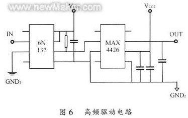 其中IN接自來於UC3879的輸出脈衝信號,CND1接控製電路地信號,GND2接被驅動MOS-FET的源極。6N137是一個高速光耦,傳輸延遲時間僅有40 ns。從控製電路來的信號經過光耦隔離後送至驅動電路,使得控製電路和驅動電路有較好的電氣隔離,消除對控製電路的十擾。MAX4426是一個專門用於M0SFET的高頻驅動芯片,其內部有兩個驅動電路,可以很容易地並聯以提供較大的輸出功率。典型上升、下降時間僅為20ns,延遲時間小大於40ns,可工作於1MHz,提供1.5A的峰值輸出電流。