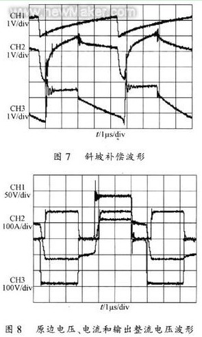 圖7為電流斜坡補償波形。通道3為原始電流采樣波形;通道1為用於補償的鋸齒波;通道2為補償後波形。補償後斜率明矽增加。 圖8所不為原邊電壓(通道3)、原邊電流(通道2)和輸出整流電壓(通道1)波形。從圖8中可清楚地看出占空比損失。