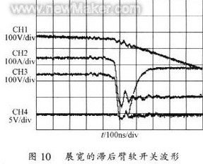 其中通道l和通道2分別為原邊電流、電壓波形;通道3為滯後臂管壓降,通道4為其驅動波形。圖10是圖9的局部展寬波形。從中可以明顯地看到當滯後臂管壓降已經諧振到零後,驅動脈衝才由低變到高,使其在零電壓下導通,實現軟開關。