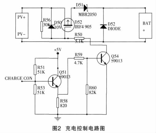 單片機(P2.0)給出充電的控製信號,即P2.0=1,NPN 型S9013 的三極管導通,由於此三極管工作於射極輸出狀態, 其發射極為高電平,Q54 (2SD667)NPN 三極管導通, 由於穩壓管D50的作用, 使得IRF4905管的柵源電壓鉗位在-10V,IRF4905 管導通, 太陽電池向蓄電池充電。反之,前兩極三極管均截止VGS=0V,IRF4905 管斷開,太陽電池不能向蓄電池充電。