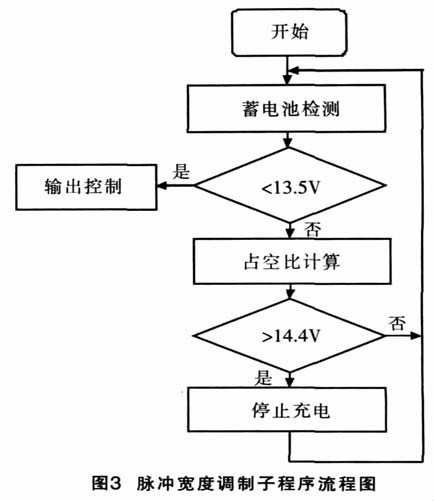 具體方案是,當檢測到蓄電池的電壓小於13.5V時,開關管始終接通,即采取全通充電方式,如果檢測到蓄電池電壓大於13.5V 並小於14.4V 時采取脈寬調製方式充電,隨著蓄電池電壓的增加,脈寬不斷的變窄,直到蓄電池端電壓上升為14.4V 時,脈寬檢校為0,停止充電。脈寬調製方式由軟件來實現。
