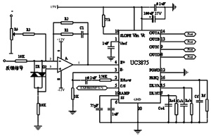 PWM移相控製是通過UC3875的誤差放大器來實現的,在UC3875的4角上接PI調節器,利用電壓傳感器將輸出電壓與給定基準電壓相比較,從而控製A、B與C、D之間的相位,最終調整波形占空比,使電源穩定在預定值上。A/B、D/C兩個半橋,可單獨進行導通延時(即死區時間)的控製,在該死區時間內確保下一個功率開關器件的輸出電容放電完畢,為即將導通的開關器件提供電壓開通條件。圖3所示是本設計的控製電路圖。