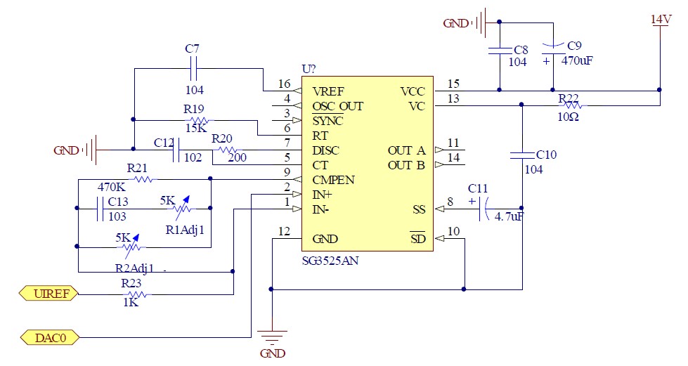 SG3525 的1、2 引腳分別為內部誤差放大器的反相輸入端和同相輸入端,反相輸入端接收反饋的電壓信號,同相輸入端為給定的電壓基準,一般接在16 引腳電壓基準的分壓上,由於題目要求恒流輸出時電流步進可調,故同相輸入端接單片機DAC 模塊產生的參考電壓。