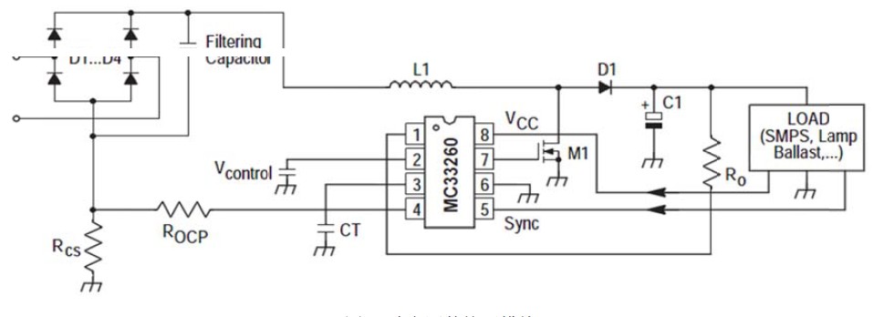 選用小功率功率因數校正芯片MC33260,它工作在電流臨界模式。MC33260應用簡單可靠。通過電流檢測和電壓反饋,通過PI調節來保持電壓恒定。通過對開關管的PWM控製來得到所需要電壓。可實現0.998的功率因數校正和輸出穩定直流電壓的功能。