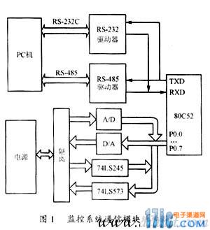 為了組建開關電源監控係統,係統中的每台電源配置了一個獨立的監控係統通信模塊。監控係統通信模塊采用的控製芯片是MCS51係列單片機80C52。80C52具有8k的內部ROM和256字節的內部RAM。監控係統通信模塊電路結構圖如圖1所示。計算機通過該通信模塊可以實時讀取電源的輸出電壓、輸出電流值以及輸出過壓、輸入過壓、輸入欠壓、過流、過熱、運行/停止等8路開關量的狀態值,並可以在輸出值允許的範圍內任意設置電源的輸出電壓、輸出電流值和複位、合閘、分閘、機控/本控4路開關量的狀態值。從監控係統通信模塊電路結構示意圖可以看出,如果計算機需要讀取電源模塊的輸出電壓、輸出電流值和開關量的狀態時,單片機收到請求命令後啟動A/D轉換芯片MAX182對電源的輸出電壓、輸出電流兩路模擬量進行轉換,轉換後的數據送入單片機進行數據處理。同時表征電源運行狀態的8路開關量從雙總線收發器74LS245讀入送至單片機寄存器存貯。單片機將所有處理後的數據按預定數據傳送格式發送給計算機輸出顯示。計算機需要設置電源的輸出電壓、輸出電流值和4路開關量的狀態時,計算機將設置好的數據按預定格式發送給單片機。單片機接收處理後啟動D/A轉換芯片MAX532和輸出鎖存器74LS573將處理後的輸出電壓、shuchudianliuzhihekaiguanliangzhuangtaizhishuchugeidianyuan。jiankongxitongtongxinmokuaicongershixianlejisuanjiduidianyuandeshishijiankong。weilebaozhengshejirenyuandeanquanhefangzhitongxinmokuaishoudianyuanyingxiangersunhuai,dianyuanyutongxinmokuaizhijiandexinhaochuandijuntongguoguangougeli。