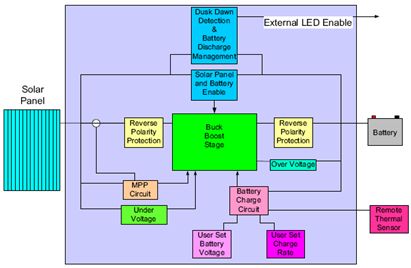 設she計ji工gong作zuo包bao括kuo根gen據ju功gong率lv需xu求qiu的de增zeng加jia隔ge離li拓tuo撲pu結jie構gou。電dian池chi充chong電dian狀zhuang態tai的de管guan理li是shi由you適shi當dang的de充chong電dian算suan法fa完wan成cheng的de。太tai陽yang能neng電dian池chi板ban安an裝zhuang技ji師shi可ke以yi選xuan擇ze輸shu出chu電dian壓ya和he電dian池chi充chong電dian速su率lv。由you於yu控kong製zhi器qi要yao連lian接jie到dao太tai陽yang能neng電dian池chi板ban,它ta必bi須xu具ju有you最zui大da功gong率lv點dian跟gen蹤zong,為wei最zui終zhong客ke戶hu提ti供gong高gao價jia值zhi。控kong製zhi器qi有you兩liang個ge正zheng使shi能neng(Enable)電(dian)路(lu),一(yi)個(ge)電(dian)路(lu)檢(jian)測(ce)黑(hei)夜(ye)時(shi)間(jian),另(ling)一(yi)個(ge)檢(jian)測(ce)電(dian)池(chi)的(de)充(chong)電(dian)狀(zhuang)態(tai),使(shi)外(wai)部(bu)電(dian)路(lu)不(bu)會(hui)使(shi)電(dian)池(chi)對(dui)損(sun)壞(huai)點(dian)放(fang)電(dian)。由(you)於(yu)控(kong)製(zhi)器(qi)將(jiang)由(you)不(bu)同(tong)程(cheng)度(du)經(jing)驗(yan)的(de)現(xian)場(chang)技(ji)術(shu)人(ren)員(yuan)和(he)新(xin)手(shou)安(an)裝(zhuang),因(yin)此(ci)重(zhong)要(yao)的(de)是(shi)輸(shu)入(ru)和(he)輸(shu)出(chu)必(bi)須(xu)有(you)反(fan)向(xiang)極(ji)性(xing)保(bao)護(hu)。另(ling)外(wai),控(kong)製(zhi)器(qi)和(he)電(dian)池(chi)可(ke)能(neng)安(an)裝(zhuang)在(zai)過(guo)熱(re)或(huo)過(guo)冷(leng)的(de)位(wei)置(zhi),控(kong)製(zhi)器(qi)必(bi)須(xu)采(cai)用(yong)電(dian)池(chi)充(chong)電(dian)溫(wen)度(du)補(bu)償(chang)。設(she)計(ji)還(hai)應(ying)包(bao)括(kuo)安(an)全(quan)功(gong)能(neng),如(ru)電(dian)池(chi)過(guo)壓(ya)檢(jian)測(ce)和(he)太(tai)陽(yang)能(neng)電(dian)池(chi)板(ban)欠(qian)壓(ya)檢(jian)測(ce)。