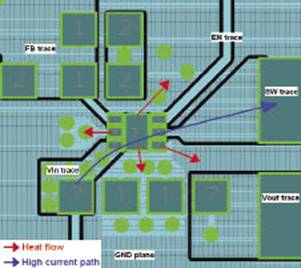 熱性能的提高可以可以通過以下特性來優化,譬如加設散熱通孔、將關鍵跡線(trace)寬度拓至最寬、使用對接地層或電源層的熱連接,或是指定熱性能增強的PCB材料(如絕緣金屬基板)。NCP1529的熱設計指南建議將VIN跡線加寬,並增加幾個通孔,建立多個對電源層的熱連接。此外,建議將穩壓器的接地引腳連接至PCB頂層。頂層、底層及所有接地層之間應當使用空餘的通孔來連接,從而增加散熱器的有效尺寸,而且這些通孔應當離得越近越好,或者在使用µDFN-6封裝時最好位於裸露焊盤底下。µDFN-6裸露焊盤必須被正確地焊接至PCB主散熱器。