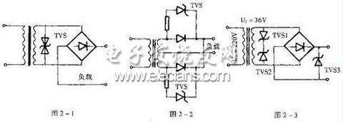 圖2-3所示電路中,單向TVS1和TVS2反接並聯於電源變壓器輸出端或選用一個雙向TVS,用以保護整流電路及負載中的元器件。