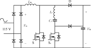 另一個降低器件電壓定額的方案是采用兩級變換結構。前級PFC校正環節可以采用帶有軟開關功能的Boost變換器,允許高頻工作。後級DC/DC功率變換級,可以采用半橋串聯諧振變換器,提供高頻電流鏈。圖7給出了適用於充電模式1的兩級功率變換電路結構圖。
