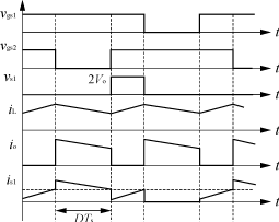 當原邊開關管S1及S2均開通時,能量儲存在輸入濾波電感中,同時輸出整流管處於關斷態。當開關管S1及S2中任一個開關管關斷時,儲存能量通過原邊繞組傳輸到副邊。由於變換器的對稱工作,變壓器磁通得以複位平衡。