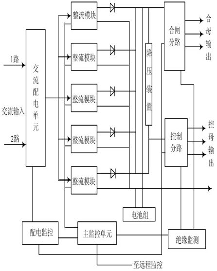 智能高頻開關電源係統的總體結構主要由主監控單元、配電模塊、交流配電單元、整流模塊等組成, 係統總體的結構圖如圖1 所示。係統中的各個監控單元受主監控單元的管理和控製, 通過通信線將各個監控單元采集的信息送給主監控統一管理。主監控顯示直流係統各種信息, 用戶也可以觸摸顯示屏查詢信息及操作,係統信息還可以接入到遠程監控係統中。係統除了交流監控、直流監控、開關量監控等基礎單位外, 還配置了絕緣監測、降壓裝置、電池巡檢等功能單元, 以達到對直流係統進行全麵監控的目的。