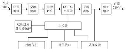 本文設計的整流模塊的工作原理框圖如圖2 所示,工作時, 模塊首先通過過防雷處理和濾波對輸入的三相交流進行處理, 這樣才能保證模塊後級電路的安全; 經過處理後的三相交流經過整流和無源PFC 後轉換成高壓直流時, 這時轉換的高壓直流要經過DC/ DC 變換器再次轉換成可變的直流電壓輸出; 另外模塊控製部分還有負責過壓、過流以及短路保護等作用, 這樣才能保證輸出電壓的穩定, 也同時能對模塊各部件進行保護。模塊還在遠程監控中提供了 四遙 ( 遙控、遙調、遙測、遙信) 接口。