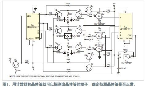 本電路經過了測試,可正常工作。但是,測試時采用的是CD4520計數器與CD4028解碼器(因為手頭沒有CD4022/CD4017 IC),這種替換應該不成問題。關鍵是電壓電平,對CMOS器件的邏輯1或邏輯0來說,它們基本是相同的。另外,也可以隻采用兩個電源電壓:±5V用於檢測基極,±15V用於檢測射極。