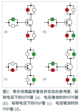 當一隻正常晶體管插在測試端子之間時,它限製電流隻能沿某些方向流動。串聯的LED表示出這些方向,因此指示出了晶體管的類型。例如,對NPN晶體管,LED發光為紅-綠-紅;而對PNP晶體管,發光為綠-紅-綠。