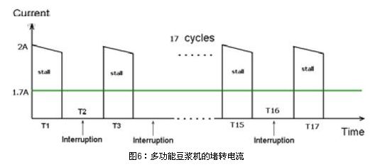 圖6為多功能豆漿機的堵轉電流。在榨水果的堵轉情況下,實測馬達的堵轉最大電流為2A,由於榨果汁時馬達也不是一直連續工作的,也是間隔一定時間工作,間隔時間是馬達工作6S,停3S,這樣換算成在一個榨水果完整工作周期內平均電流是1.6~1.7A。在1.6~1.7A堵轉電流下,馬達堵轉需要保護的時間要求在150S內。