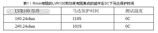 選取兩片Rmin電阻0.22ohm 的LVR100和功率電阻集成的組件,下麵表1為馬達的保護時間。
