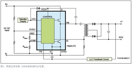 在高壓電源轉換電路設計中,諸如電源噪聲、開關頻率、開關損耗、電源體積、可靠性等問題一直是關鍵所在。與其它的高壓拓撲結構相比,LLC轉換器因效率高且設計的電源體積小,在高壓電源適用領域一直受到設計師的青睞,不過其設計難度也非常大。Power Integrations公司(PI)不久推出的HiperLCS係列LCS700-708高壓LLC電源IC,將變頻控製器、高壓端和低壓端驅動器以及兩個MOSFET同時集成到了一個低成本封裝中,具有出色的設計靈活性,其最高負載效率超過97%,並利用高頻開關來減小變壓器的尺寸和輸出電容的占板麵積,由此達到縮小電源尺寸的目的。圖1所示為HiperLCS功率級的電路簡圖,其中LLC諧振電感集成在變壓器中。變頻控製器通過零電壓(ZVS)開關功率MOSFET,消除開關損耗,從而達到高效率。