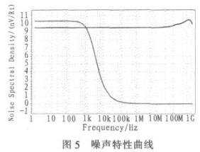 噪(zao)聲(sheng)是(shi)影(ying)響(xiang)帶(dai)隙(xi)基(ji)準(zhun)源(yuan)穩(wen)定(ding)性(xing)的(de)主(zhu)要(yao)因(yin)素(su)之(zhi)一(yi)。通(tong)常(chang)噪(zao)聲(sheng)分(fen)為(wei)外(wai)部(bu)噪(zao)聲(sheng)和(he)內(nei)部(bu)噪(zao)聲(sheng)。外(wai)部(bu)噪(zao)聲(sheng)一(yi)般(ban)都(dou)由(you)電(dian)源(yuan)電(dian)壓(ya)的(de)變(bian)化(hua)以(yi)及(ji)其(qi)他(ta)電(dian)路(lu)的(de)幹(gan)擾(rao)造(zao)成(cheng)。內(nei)部(bu)噪(zao)聲(sheng)主(zhu)要(yao)包(bao)括(kuo)熱(re)噪(zao)聲(sheng)和(he)閃(shan)爍(shuo)噪(zao)聲(sheng)。閃(shan)爍(shuo)噪(zao)聲(sheng)的(de)大(da)小(xiao)與(yu)頻(pin)率(lv)成(cheng)反(fan)比(bi),因(yin)而(er)在(zai)低(di)頻(pin)下(xia)主(zhu)要(yao)為(wei)閃(shan)爍(shuo)噪(zao)聲(sheng),而(er)高(gao)頻(pin)下(xia)為(wei)熱(re)噪(zao)聲(sheng),對(dui)於(yu)高(gao)頻(pin)的(de)熱(re)噪(zao)聲(sheng),可(ke)以(yi)在(zai)輸(shu)出(chu)端(duan)Vref處加一個RC低通濾波器解決掉,而低頻的來自耦合到電源的噪聲則是需考慮的,可以通過提高電源抑製比來減小。圖5為電路在輸出端和電源電壓處的噪聲特性,在輸出端低頻時噪聲為10.4 nv/Rt,高頻時噪聲幾乎為0 nv/Rt,性能很好。電源電壓處的噪聲為9.6nv/Rt左右。