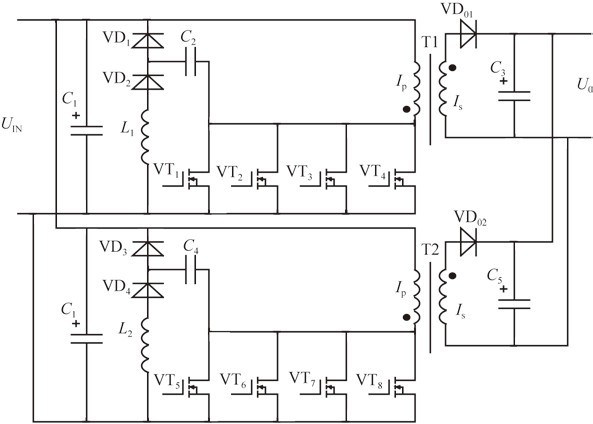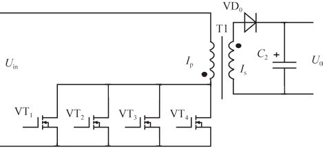 如圖2所示,該電路的特點是,主功率電路采用4隻功率管並聯,每隻功率管通過的電流為單管應用時的1/4(假定4隻功率管參數一致),則功率管的導通壓降也應為單管應用時的1/4.根據計算,在輸出550W時,理論上,4管並聯比單管可減小通態損耗約20W,提高效率近3個百分點。