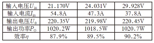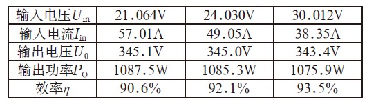 由兩路單端反激並聯組成的逆變電源前級DC/DC電路(見圖5),輸出功率約1.1kW,試驗結果如表1所示。